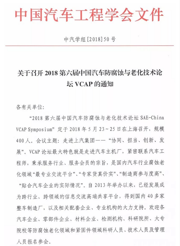 “2018第六屆中國汽車防腐蝕與老化技術(shù)論壇SAE-China VCAP Symposium”定于2018年5月23~25日在上海召開,規(guī)模400人。